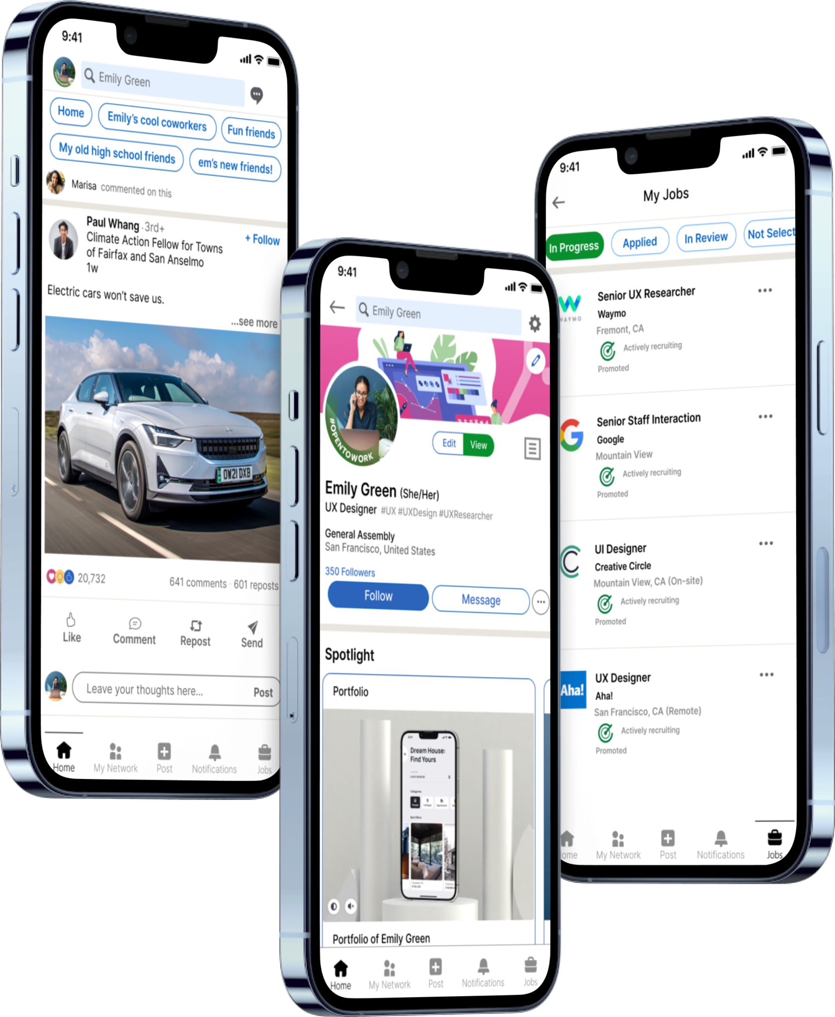 Redesign of promising LinkedIn app by creating more tools for makers to show off their work, convenient job search, and editable connection lists.