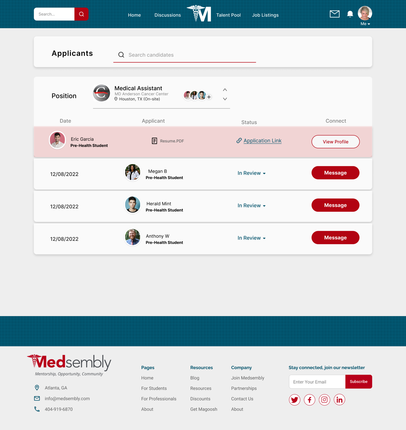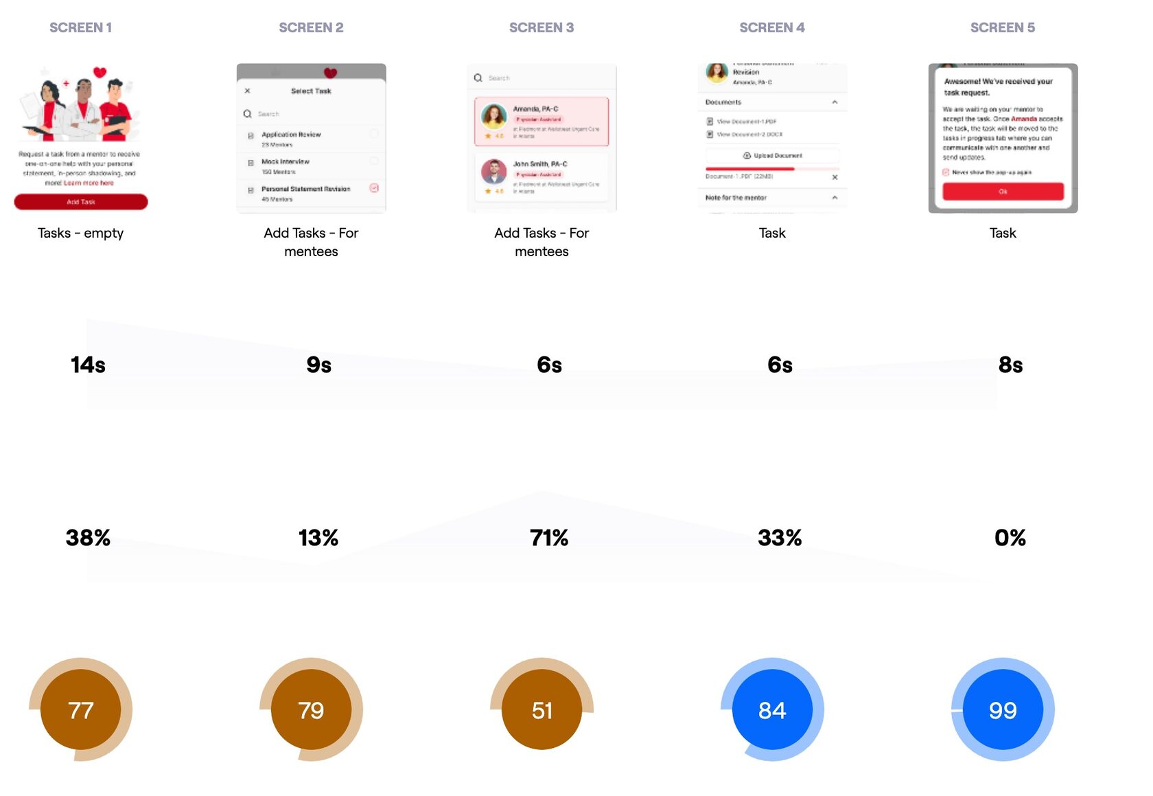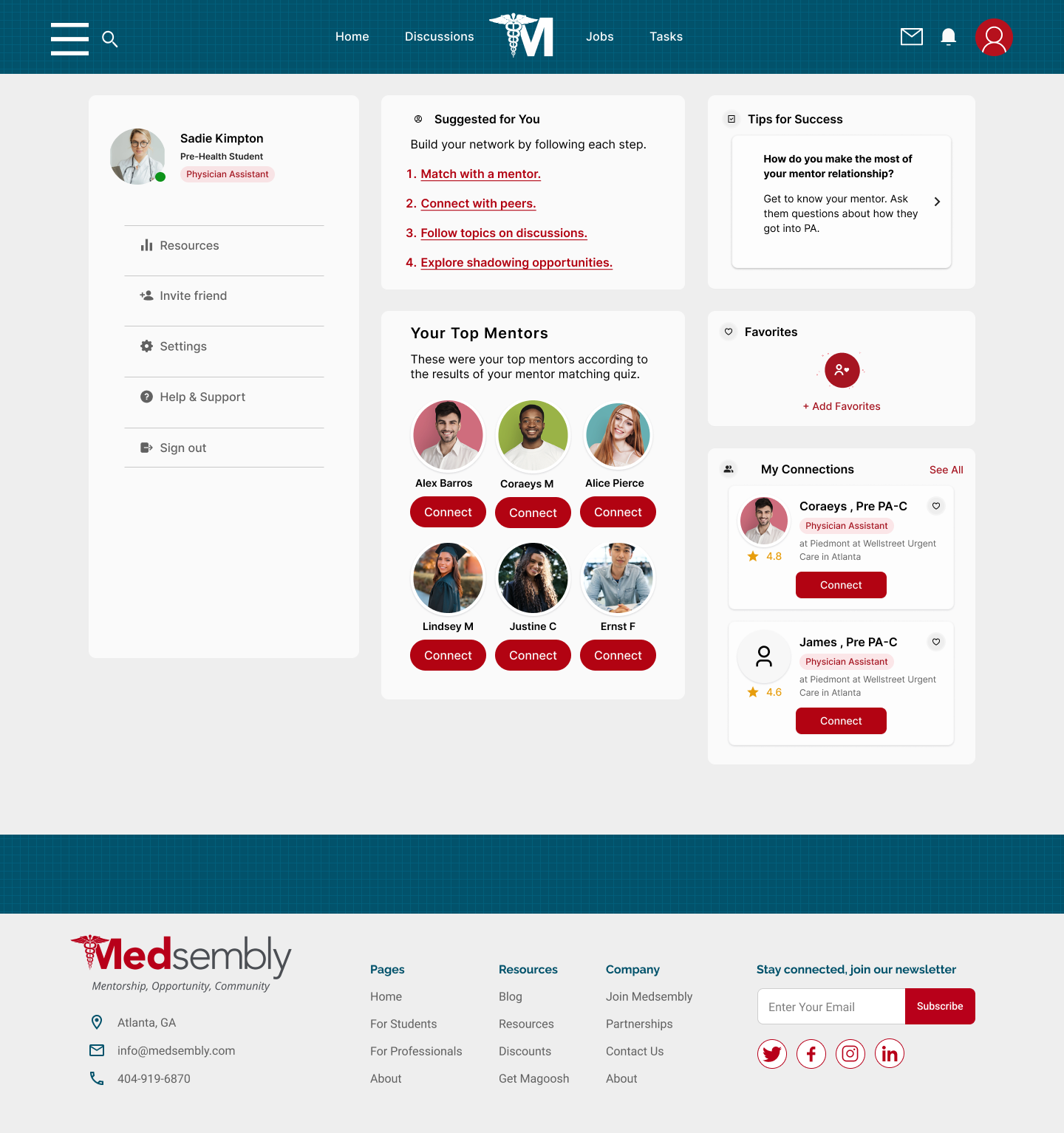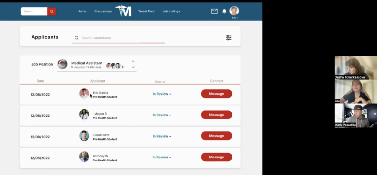 Towards the end of our 3 week sprint, we held a final client meeting and presented our two latest high fidelity prototypes, which included preference testing results. The presentation in front of the founder of Medsembly as well as our mentor and the General Assembly team was a great experience and the end result was well received. It was important for the client that we first make the site parity with the application, while focusing on the experience of using the website by the mentor and recruiter, and our team was able to complete this in a short time. In the future, if we were to work with Medsembly again, we would like to work on path improvement for mentee, events page, news feed, and delve into settings and deeper navigation.
